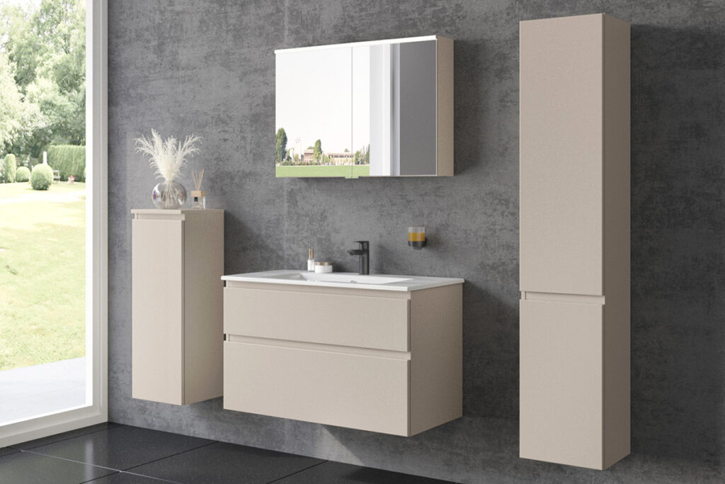 Die Badmöbelsets bestehen aus einem Waschtischunterschrank mit Waschtisch und einem Spiegelschrank. Zur individuellen Gestaltung gibt es das Set in unterschiedlichen Breiten und Oberflächendekoren. Im Inneren beeindrucken die Waschtischunterschränke und Spiegelschränke mit viel Stauraum. Ergänzend können Hoch- oder Halbhochschränke mit den Badmöbelsets kombiniert werden. Die Waschtische sind ebenso wie die Thermofronten der Waschtischunterschränke leicht zu reinigen.